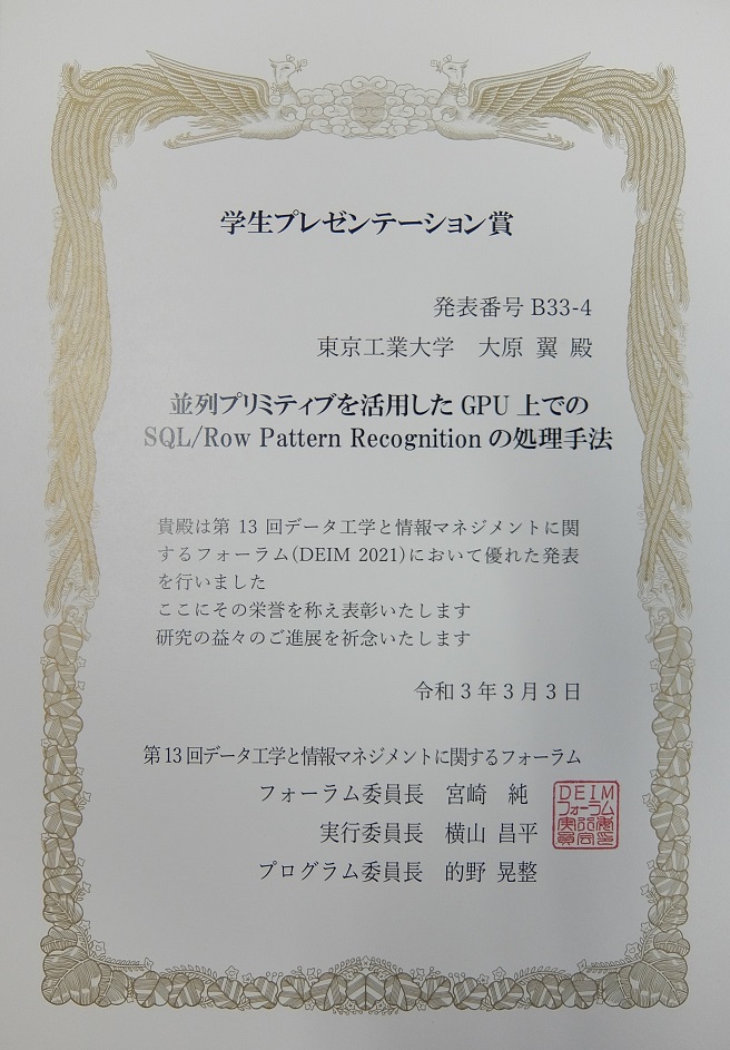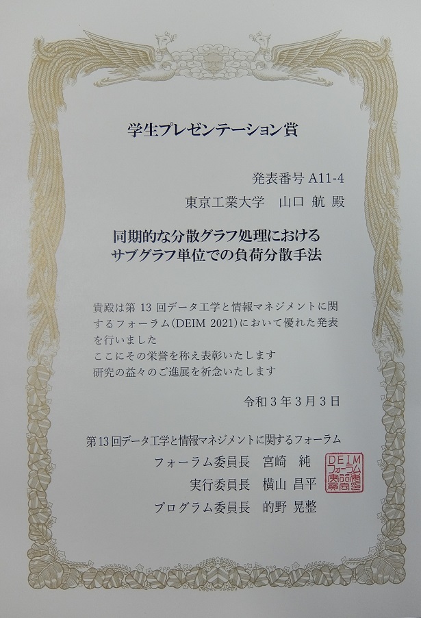 M2の大原、山口がDEIM2021で学生プレゼンテーション賞を受賞
